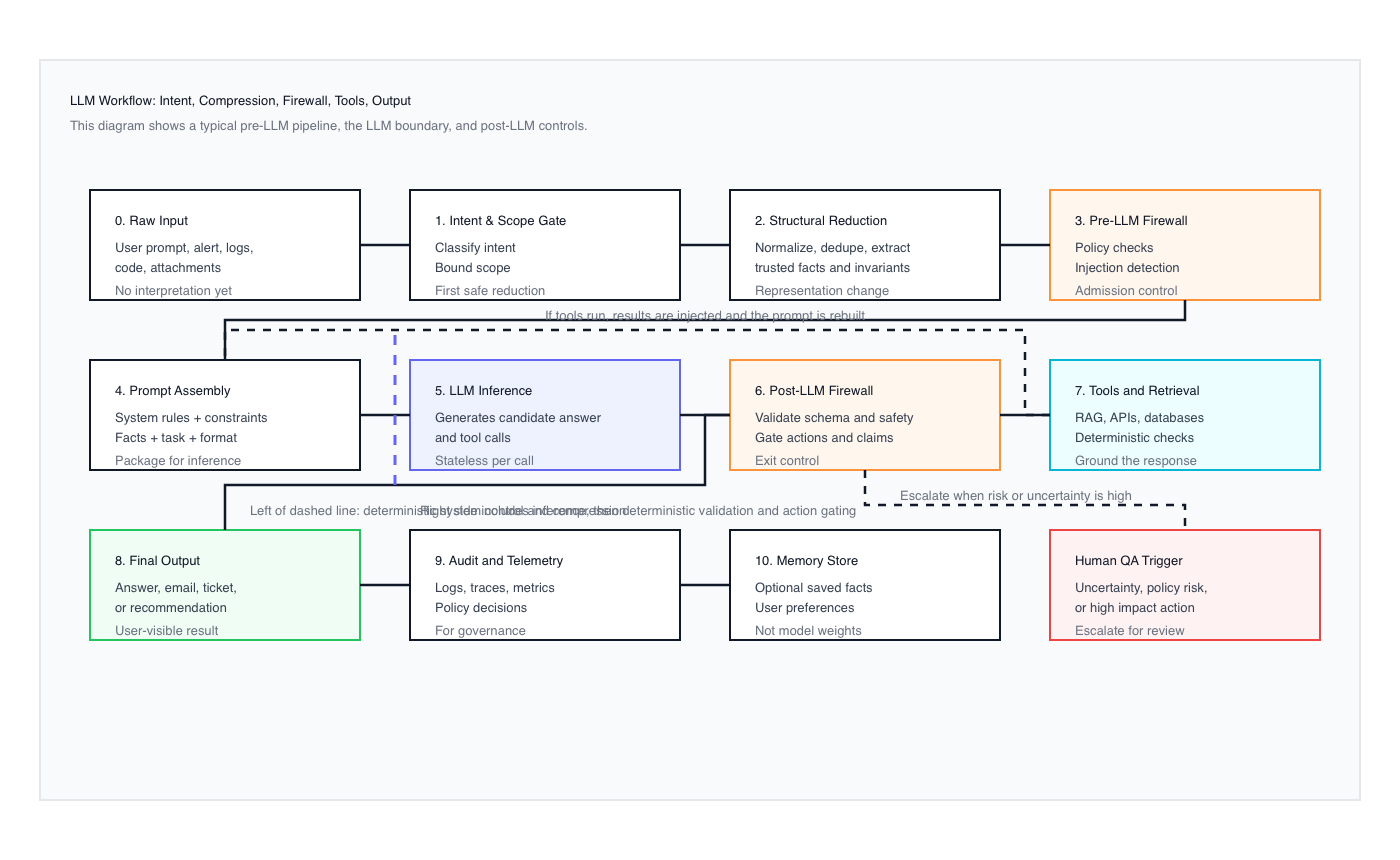 This is where the system, not the model, begins to meaningfully improve outcomes. One of the important contributions highlighted by work such as DeepSeek was a shift away from treating the LLM as the center of intelligence and toward treating it as one component in a broader process. Rather than assuming that larger models and longer prompts would automatically produce better results, the focus moved to intent and scope gating, structural normalization, and pre-model reduction. The insight was simple but powerful. Long-term knowledge lives in the model, but short-term working knowledge lives in the system that prepares each request. By reducing ambiguity, extracting trusted facts, and performing deterministic analysis before invoking the LLM, the model is given a smaller and cleaner problem to reason about. The result is not a smarter model, but a better constrained one. Shorter, more precise prompts often outperform longer ones because they reflect decisions already made by the system. Accuracy improves not because intelligence increases, but because intelligence is redistributed. Reasoning is reserved for what truly requires it, while structure, state, and validation are handled elsewhere.
